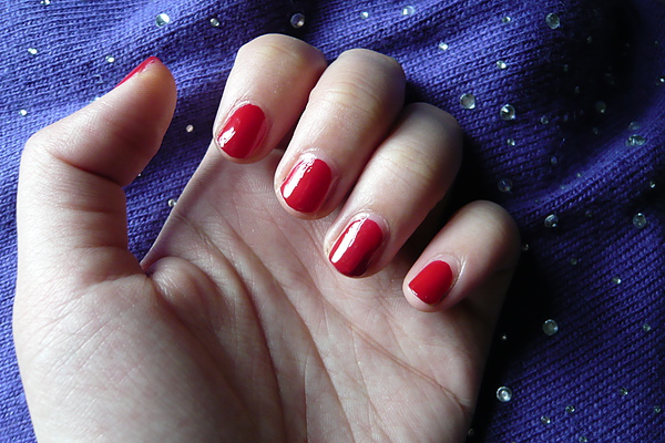 這顏色其實是很基本款的偏玫紅的正紅色,塗個兩三層會略偏深紅。