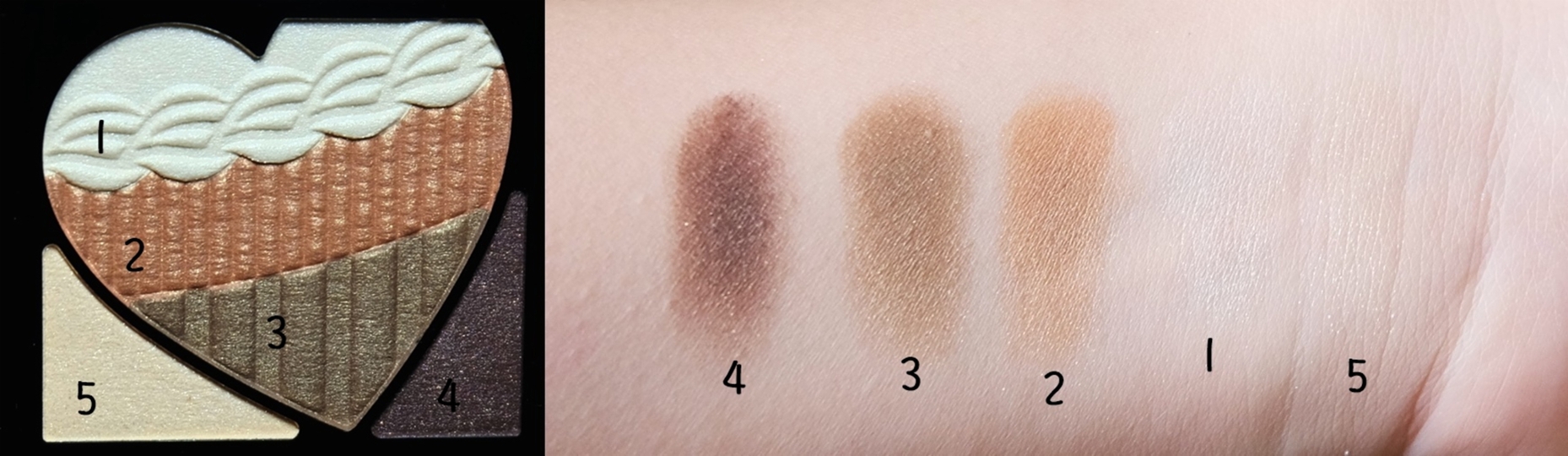 手部試色 除了5的臥蠶色是亮片外 1/2/3都是細微珠光 眼線色4稍微霧面