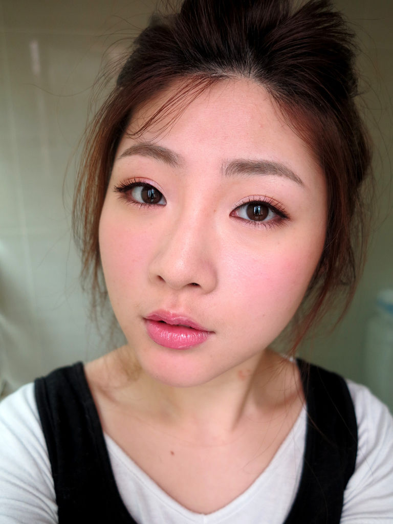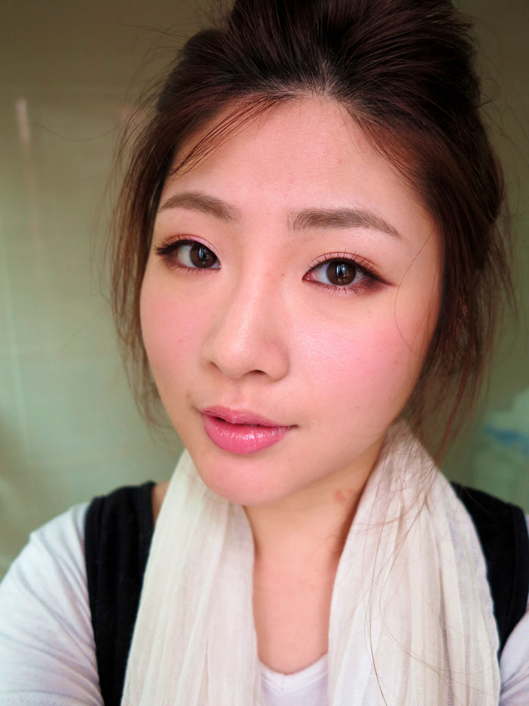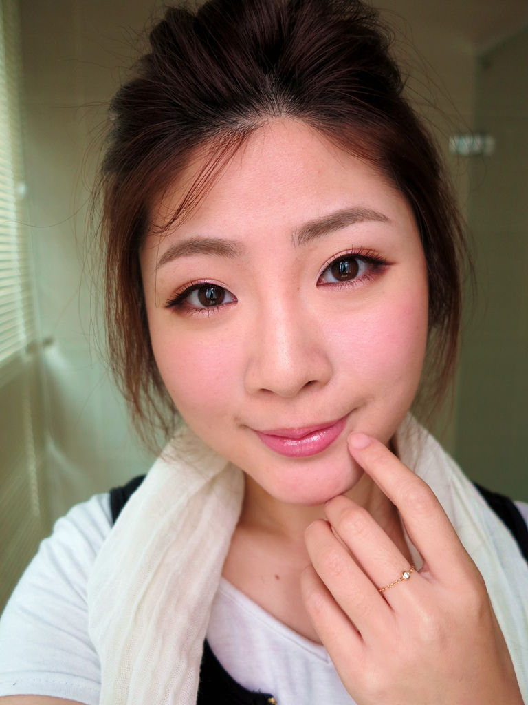 眼線用深咖啡色輕輕帶過,臥蠶的地方在壓上一點粉紅色!而睫毛膏現在愛用的是咖啡色