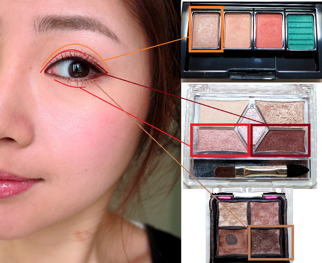 眼妝的部分先用膚金色打底、眼頭眼中壓上粉紅色、上下眼尾ㄑ字部位用酒紅色暈染、下
